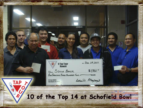 Marvel at this; 1 - Shot 949 in the 1st squad, not happy; 2 - Was not sure whether he should reenter but does in the 3rd and final squad; 3 - Starts out red hot with games of 268 and 300; 4- Throws the front 5 no taps, got real excited and nervous, throws back to back splits and shoots 208; 5 - With the pressure on and needing to shoot at least a 220 game, Darrell finishes with a 222 and wins the Barbers Point Tourney worth $1309 and $100 for the 5 No Taps.