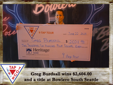 At the end of the day, Greg Burdsall ended up being on top of the Cash List, winning his 5th 9-Tap Tour Championship, scoring a great 841. Greg said that he was in the proverbial 'Zone', but he had been in that position before, and was still nervous, even though he was shooting so well. Greg was shooting so well, that he had the lead after his third game, meaning his 4th game could be his 'throw-away' game. Rob kiddingly told him that whatever he shot in game #4 would be deducted from his first 3... he tossed out a 222. The $2,604.00 check has now pushed his career earnings over $28,000.00 which doesn't include side pots. Greg liked to thank his brother, Eddie, for rooting him on, and the staff for running such a smooth tournament.