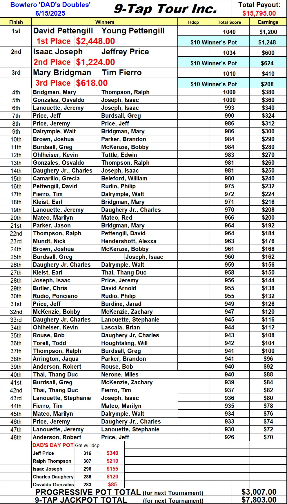 In just 4 squads, we broke last year's (5-Squad) Dad's Day Doubles record, with 217 bowlers combining to create 239 Doubles teams. That means that most bowlers took advantage of the 'Multi-Cash' aspect of this format, averaging 2.2 partners per entry. There was a huge number of bowlers who cashed multiple times led by Isaac Joseph who led the way by making the Cash List SEVEN TIMES, while Charles Daughery Jr was close behind Cashing SIX times. The 9-Tap Jackpot got off easy as 6 bowlers shared $300.00 for each getting 3-Taps worth $50.00 each. That pushes the Jackpot up to $7,803.00 for next week at Bowlero-Acme at Southcenter. We had several Father & Son teams on the Cash List, along with a Brother & Sister and a few Husband & Wife pairings, that included our Bowlero Champions. We also had a 'sort of' brother combo with the Price brothers in 8th.