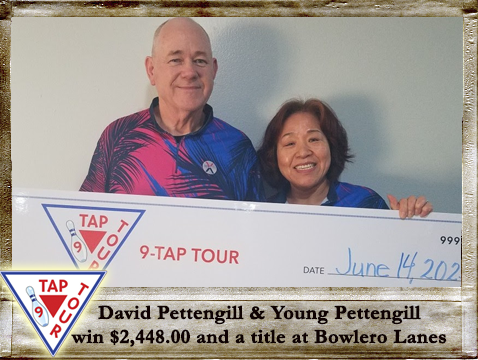 David & Young Pettengill each earned their first Tour Title, with some consistent scores. Their 1040 series gave them a nice 6-Pin victory, as one of 5 teams to Top 1000. David had really struggled last week and was still upset with himself when he arrived Saturday, grumbling about his previous bad scores. A few hours later he was beaming, with a grin from ear to ear, with how well he and Young had bowled. Proof that you never know when you'll get HOT... usually when you least expect it!! Obviously, Young also shot well above her average, which of course is the secret to a winning Doubles team. David and Young want to thank the other bowlers on their lane for cheering them on. David said he was in the zone and felt very confident. He said they don't have any special plans for the winnings, but Young is going to Vegas next week so it will come in handy.