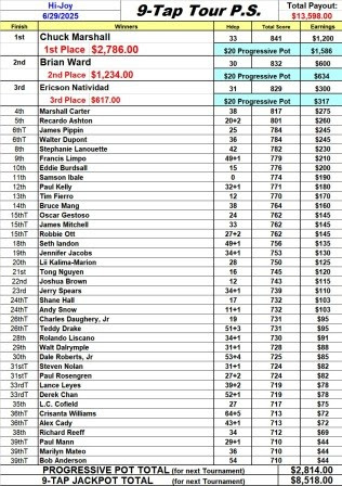 The 9-Tap Jackpot had an interesting day of ups and downs. Isaac Joseph had the Middle-6 Taps going, and when the ball hit the pins it look like the 6 pin was going to stay standing, until the "Messenger" came shooting across the deck knocking it out, and giving Isaac a real strike (click here to watch video). It looked like we were going to be paying out 3 bowlers, when in the last game of the day, James Pippen hit the Front-5, and won the $375.00 consolation prize. The 9-Tap Jackpot will be at $8,518.00 when we comeback from break.