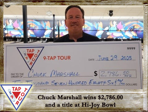 Most all bowlers think that they will do really well in the house that they bowl in, but end up getting frustrated cause the shot is different. Luckily this wasn't the case for our 1st time 9-Tap Champion, Chuck Marshall, shooting an incredible 841. Chuck bowls morning leagues at Hi-Joy since he retired from Costco, enjoying a 32 year career. Chuck was wearing his Dexter SST-8 shoes on his way to victory, and wanted thank his best friends Teddy Drake, Brett Harrison, Jenn Jacobs, and Shane Hall for all of their support. Chuck earned a crisp $2,786.00 for his great effort on the day. Congratulations Chuck!
