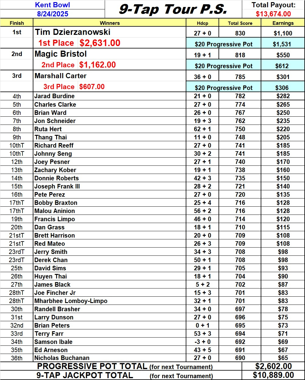 This Sunday, 9 Tap Tour was at Kent Bowl, only two bowlers managed to shoot higher than 785 and the rest of the Cash List scores were also on the light side. We suspect the NEW Air Conditioning System had an effect on the lane conditions, but the GOOD NEWS, it was definitely cooler than other Summer tourneys at Kent Bowl. The 9-Tap Jackpot was threatened a few times by Magic Bristol & Jon Schneider, with Jon also getting both the Front 6 of 7 and shot at #7 for the 7-Middle Taps (see pics). Ultimately, the Jackpot got off easy with two bowlers James Black & Marshall Carter, getting the Front-4 for $150.00 each.