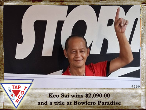 position today. Starting his first 3 games for the squad with an 842, he needed to improve from his earlier 193 (scr) game to surpass the 844 that was the 'leader in the clubhouse'. It was looking tight, but after strikes in frames 8 & 9, he only needed a spare and a good count to take the lead. A 10th frame baby-split looked like it might derail that effort, but like a Champion, he stepped up and made the spare, giving him a narrow THREE pin VICTORY!!! Keo said that his close friend and fellow Tour Member, Raymond Sedeno, who passed away last month, was riding on his shoulders on the critical shot and helped him earn the $2,090.00 Winner's Share.