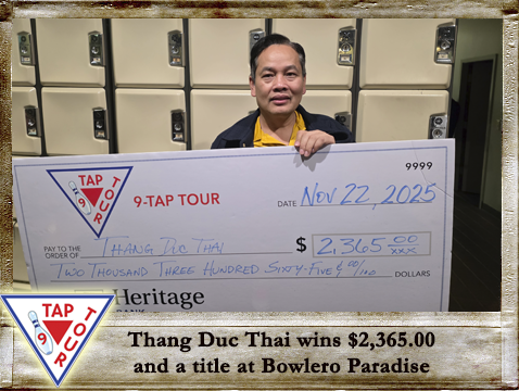 for drilling his ball and the continued support from his brother Huyen Thai for bowling with him every week. He intends on using his 1st place earnings of $2,365.00 for presents for the family and future 9-Tap events. Already #4 on the Tour's career prize money list, the Hall of Fame bowler now totals an impressive $70,029.00. He works in the Casino at Roxbury Bowl in South Seattle.