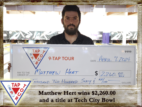 You can't keep a HOT bowler down! Matthew Hert earned his 1st Title just two weeks ago, after many months of struggling on the Tour. Matt had accumulated FIVE Bonus Pins during that drought, until a 28th Place finish broke the drouhght, cutting him down to 4 Bonus Pins. Then the DAM BROKE...with his first Win he lost all 4 Bonus Pins, and in the last 2 weeks, he also lost 4 pins of handicap. Losing a total of 8 pins per game, doesn't slow down a HOT bowler, as we have seen before. Matt wore his Dexter C9 shoes while rolling his Hammer 3.0 ball this week, drilled by Randy Macomber of Papa's Pro Shop, shooting the top score of 794. Matt said that he will be using his $2,260.00 winnings for a family vacation, and wanted to thank his family, and his friend Andrew Fuller for their support. Congratulations Matt on your 2nd Tour Championship!