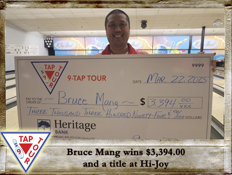 1st Place - Bruce Mang had the 'Bowling Day' of his life Saturday, earning his 1st Tour Title in the process! It's always fun for us, whenever a Tour Member wins and is as excited as Bruce was with his win. He barely shot his average in his first game but then got so HOT that he averaged a monstrous 70 pins per game over his average for his last 3 games. THAT'S HOT!!! Wearing his Dexter SST 8 shoes and throwing his Storm 'Absolute' ball, Bruce scored an 'out-of-body' 873. It was easily his best performance since joining the Tour last year and it included his highest game (266) and best series ever. He received a huge payday of $3,394.00 for his stellar performance. The only previous Top 5 finish Bruce had was a 2nd Place at Bowlero-Acme last year. Bruce wants to thank his mentor July Soun and his 9-Tap family for always believing in him. He had to take some time off the last 6 weeks because of a bad case of the flu, but boy did he come back better than ever! (not a recommended training proceedure)